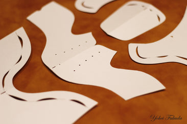 パターンをもとに丁寧に裁断し、最終的に出来上がる靴と同じ手順でアッパーを製作いたします。